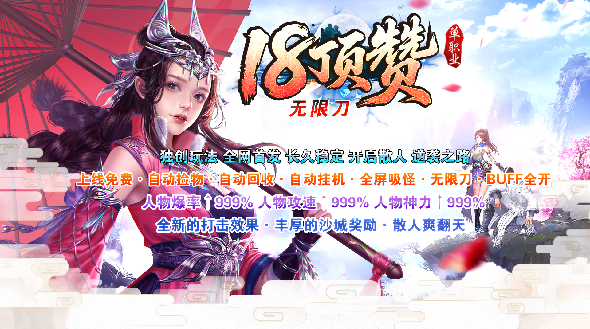 ◆18顶赞◆120格大背包◆免费自动挂机◆免费自动回收◆免费自动捡取◆自动吸怪◆自动穿戴◆无限刀◆